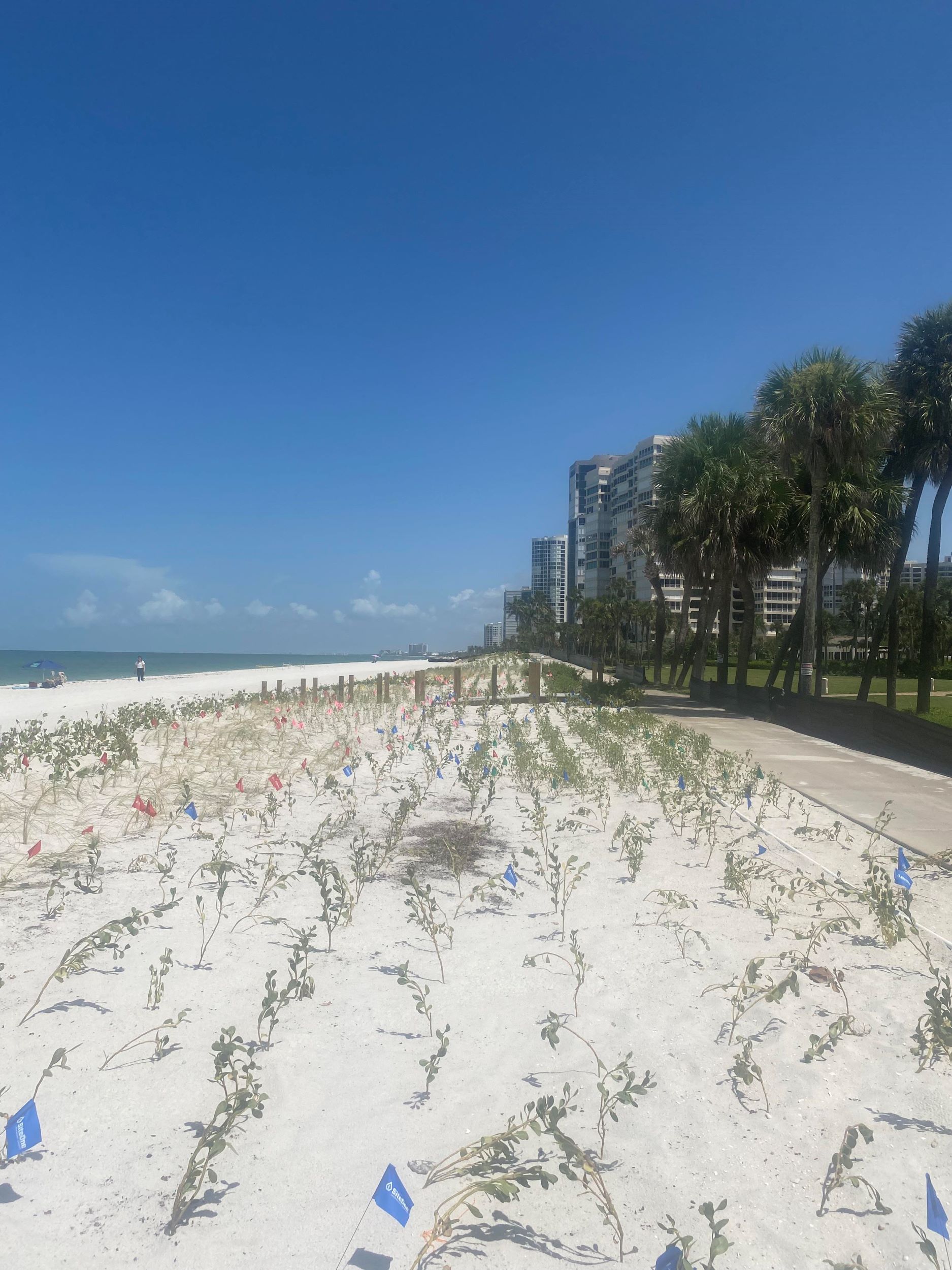 In the section to the north of the Park Shore Association (PSA) Beach Park, the three beach commons associations in that area have themselves constructed a 13-foot berm that extends all the way north to the public beach access point at Seagate Drive. This entire area, extending from the Regent to Le Parc, has been newly planted with native vegetation. A permit has been issued to permit temporary irrigation of these plants.