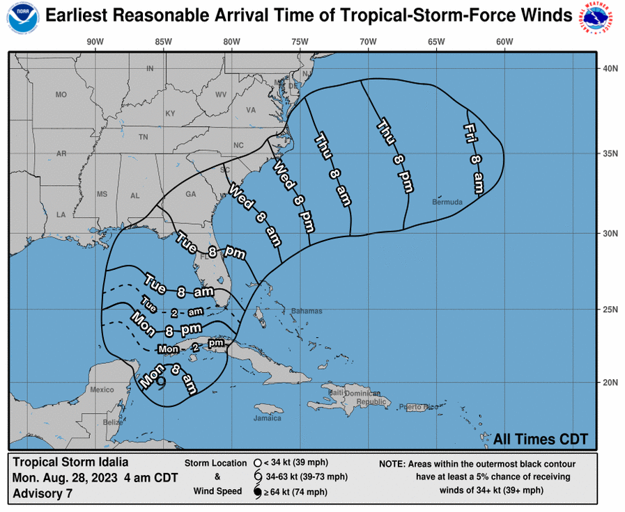 The City of Naples continues to closely monitor the trajectory of Tropical Storm Idalia, and its potential strengthening, path, and possible impacts to our area. As of 8:00am EDT, the National Hurricane Center has Tropical Storm Idalia located approximately 375 miles southwest of Key West. TS Idalia is moving northward at 8 mph with sustained maximum winds of 65 mph. Collier and Lee Counties remain outside of the forecast cone, but this could change as Idalia moves into the warm waters of the Gulf of Mexico. Coastal Collier County remains under a Tropical Storm Watch as well as a Storm Surge Watch. It is possible to begin feeling tropical storm-force winds and rain late this evening into Tuesday morning.