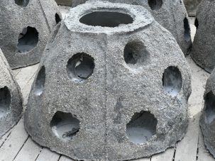 It took 4300 cubic yards of riprap to create the reef. In addition, 215 reef balls were dropped into the bay along the perimeter of the seawall which wraps around the Village Shops. Riprap prevents erosion and facilitates the growth of plants and crustaceans. The reef balls are porous in appearance and promote marine life. Water flows through the holes and algae, oysters, barnacles, and coral attach to the rough surfaces.