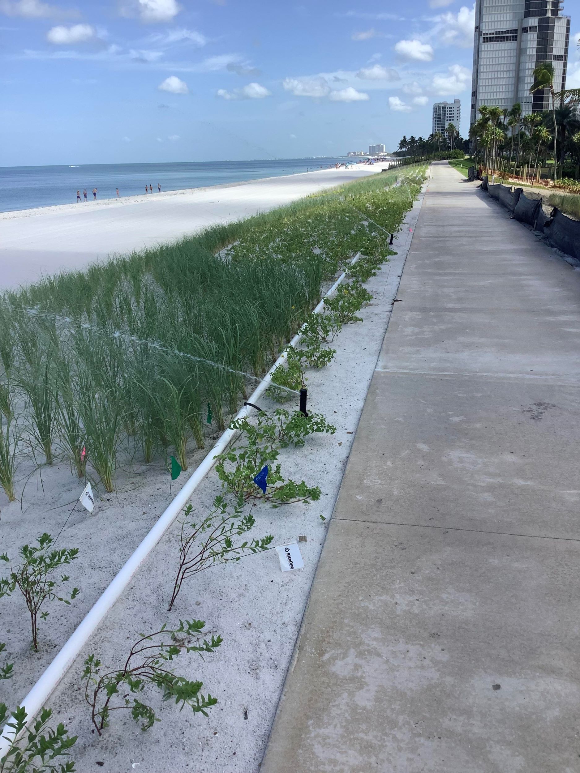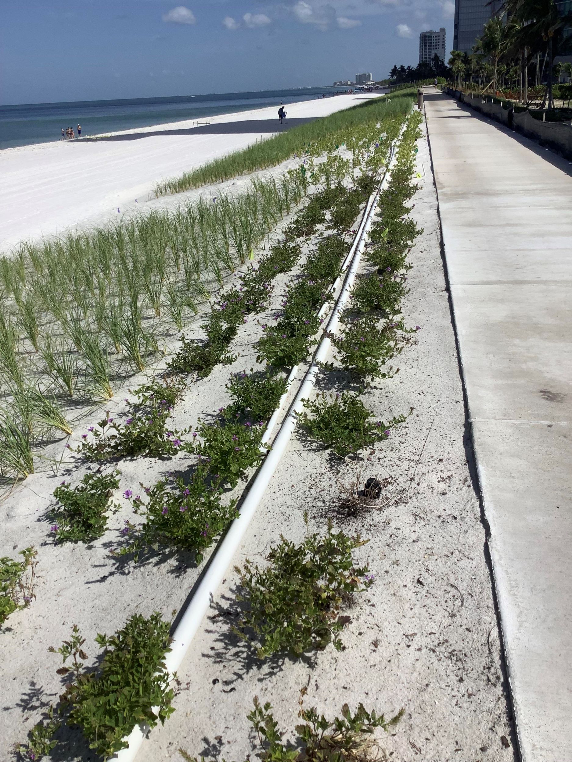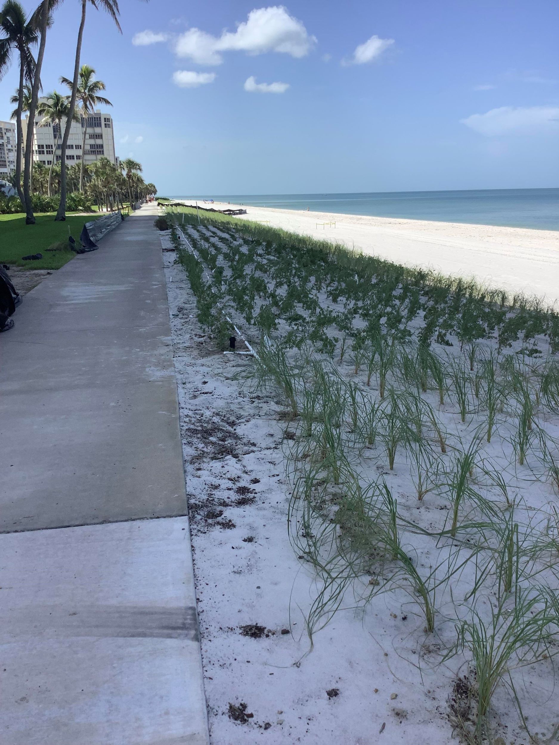 In the section to the north of the Park Shore Association (PSA) Beach Park, the three beach commons associations in that area have themselves constructed a 13-foot berm that extends all the way north to the public beach access point at Seagate Drive. This entire area, extending from the Regent to Le Parc, has been newly planted with native vegetation. A permit has been issued to permit temporary irrigation of these plants.
