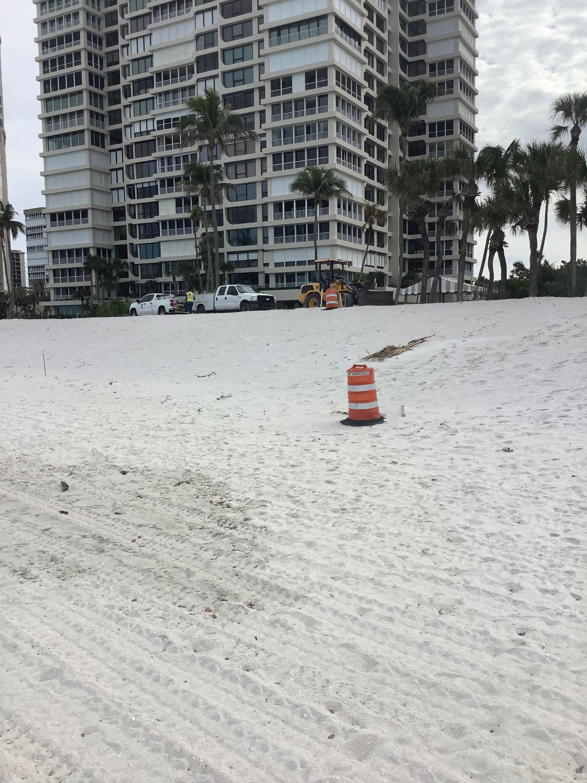 The City of Naples had put in place an emergency order which permitted the initial cleanup to proceed very expeditiously. Kavalo, an experienced earth moving contractor, was engaged by the three commons associations north of Lutgert Park which had sustained the most damage. They have been working for the last month in removing and carting away the concrete sidewalk, as well as in rebuilding the 13.5 foot storm dune and berm in preparation for construction of a new beachwalk.