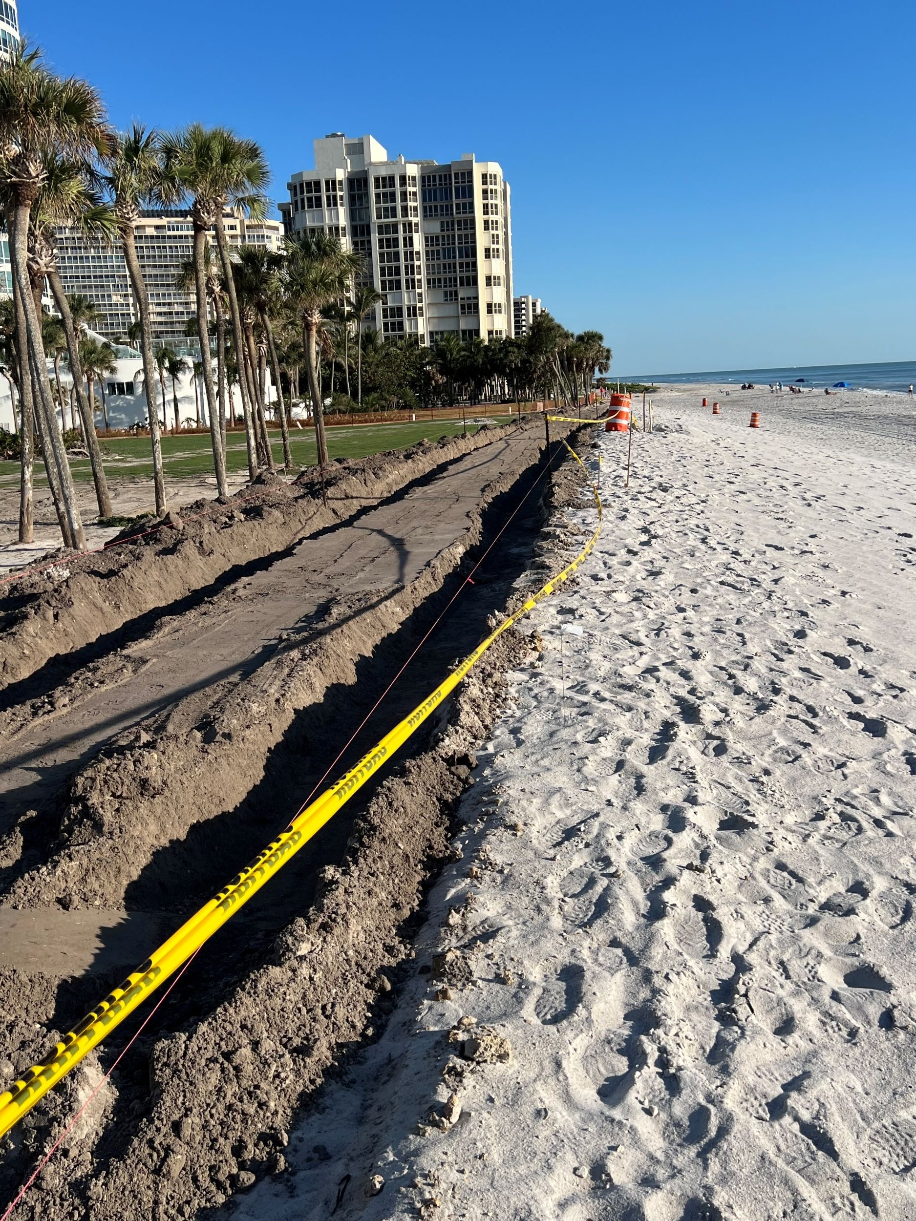 The concrete footer trenching is underway and the pouring of the concrete should commence next week. Once that is completed, the full length of the beach promenade will be restored, much to the joy of those who walked it daily. The 13.5-foot sand dune that was constructed in the northern segment will be planted with vegetation to help protect it from erosion and the plan is to construct dune overpasses to facilitate beach access.