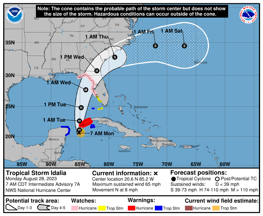 The City of Naples continues to closely monitor the trajectory of Tropical Storm Idalia, and its potential strengthening, path, and possible impacts to our area. As of 8:00am EDT, the National Hurricane Center has Tropical Storm Idalia located approximately 375 miles southwest of Key West. TS Idalia is moving northward at 8 mph with sustained maximum winds of 65 mph. Collier and Lee Counties remain outside of the forecast cone, but this could change as Idalia moves into the warm waters of the Gulf of Mexico. Coastal Collier County remains under a Tropical Storm Watch as well as a Storm Surge Watch. It is possible to begin feeling tropical storm-force winds and rain late this evening into Tuesday morning.