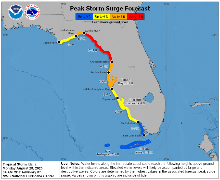 Current projections have Idalia moving in a Northward direction while strengthening to a Category 1 hurricane later today. The storm is expected to move quickly and strengthen to a Major Hurricane (sustained winds greater than 110 mph) when it is located off Tampa’s west coast Wednesday morning. The latest maps from the NOAA National Hurricane Center are included below for reference.