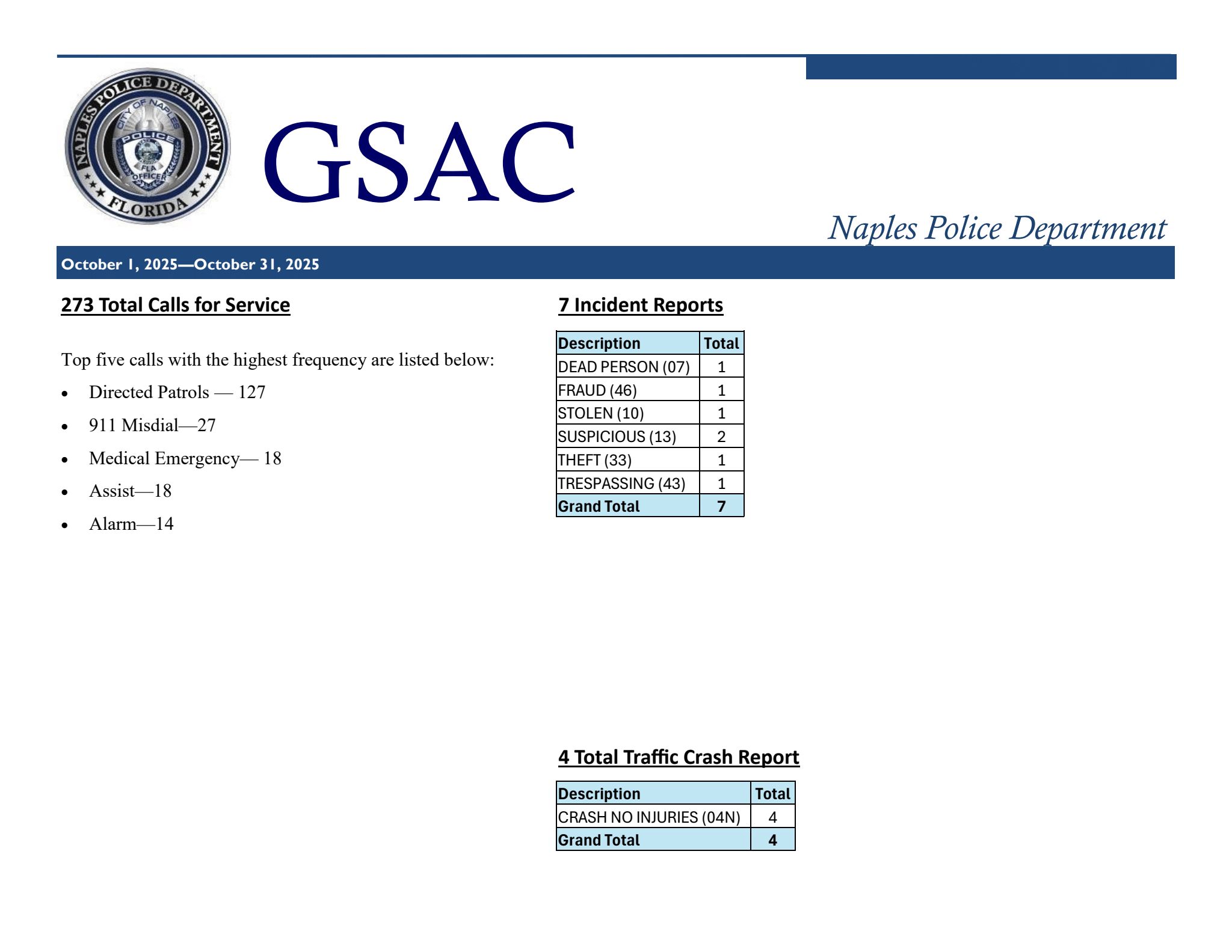 View Larger Image Police Blotter Report: October 2025 By Officer Jeff Perry, Naples Police Department By GSACNaples|2025-11-19T15:27:12+00:00November 19th, 2025|News|0 Comments Share This Story, Choose Your Platform! FacebookTwitterLinkedInPinterest Related Posts 2025 – 2026 GSAC Board Meeting Schedule 2025 – 2026 GSAC Board Meeting Schedule August 11th, 2025 | 0 Comments 2025 Sea Turtle Watch 2025 Sea Turtle Watch April 30th, 2025 | 0 Comments Young Hits the Road Running Young Hits the Road Running April 23rd, 2025 | 0 Comments Naples’ Condos Rise to the Milestone Challenge Naples’ Condos Rise to the Milestone Challenge April 23rd, 2025 | 0 Comments MPOA Surveys Residents While City Moves Ahead with Mast Arms Plan MPOA Surveys Residents While City Moves Ahead with Mast Arms Plan April 23rd, 2025 | 0 Comments
